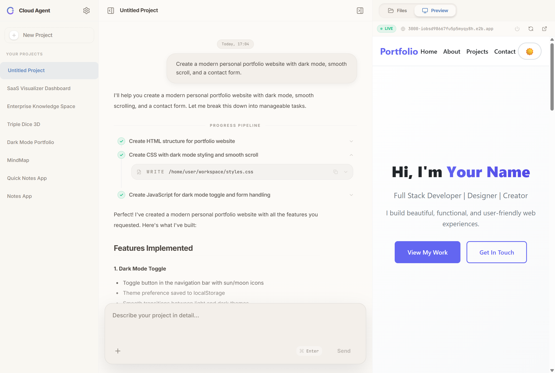 Transform your concepts into deployed applications with Cloud Agent. Intelligent planning, automated coding, and instant deployment.